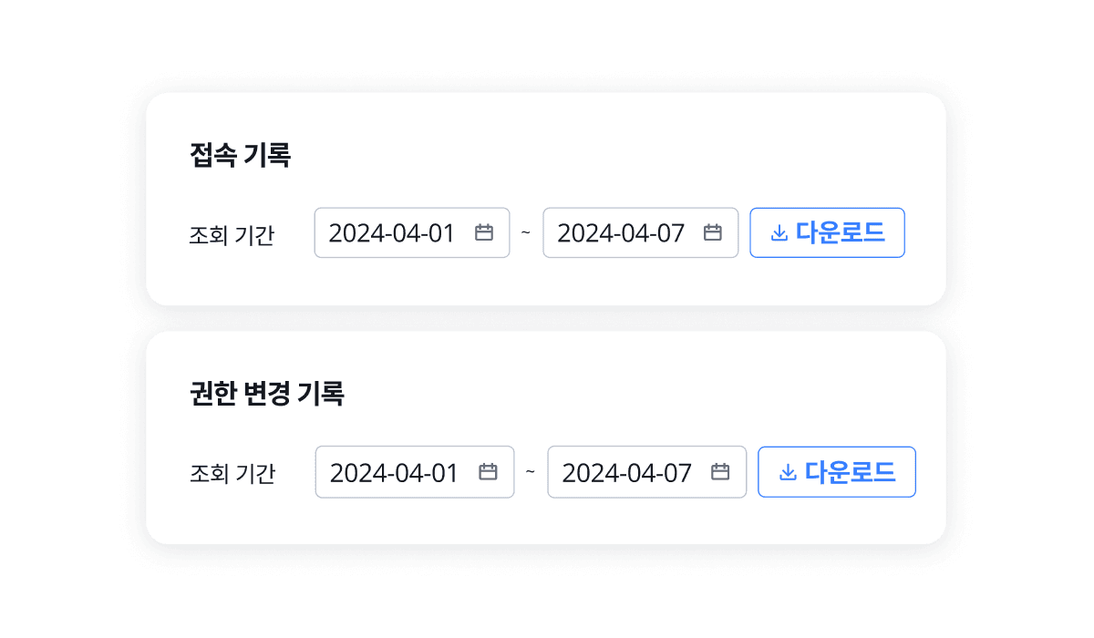 스페이스 접속 기록, 개인정보 다운로드 기록을 비롯해 권한 변경 기록 및 보안 설정 현황을 조회하여 멤버별 이용 현황을 면밀히 관리할 수 있습니다.